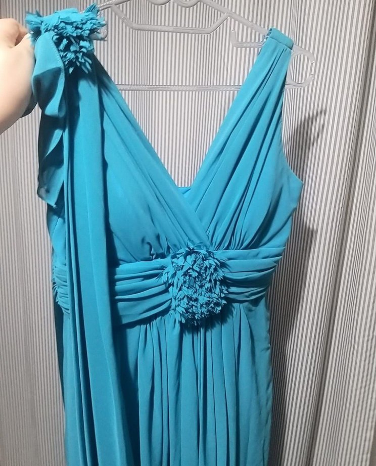 V yaka, drapeli ve kolsuz, koyu mavi renkte, bel ve omuzda çiçek detaylı uzun abiye elbise. Düğünler için uygun.