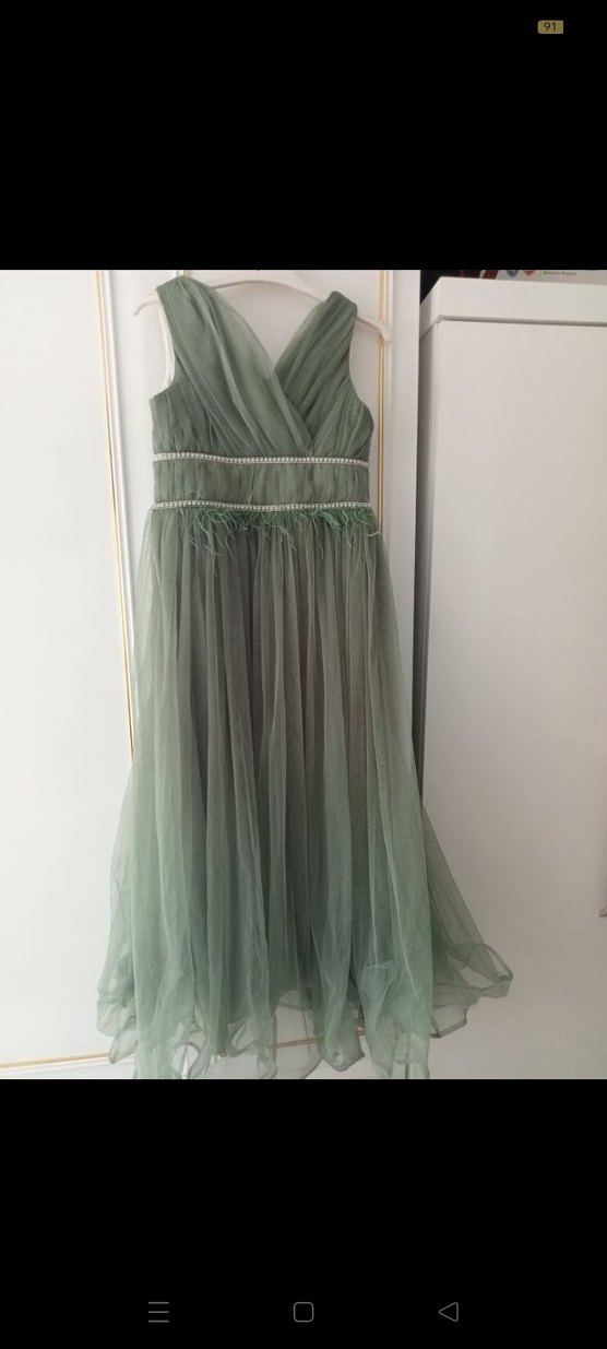 Kolsuz, drapeli V yaka ve uzun etekli yeşil abiye elbise. Beldeki ince detaylar vintage ve modern klasik tarzı yansıtır, düğünler için uygun.