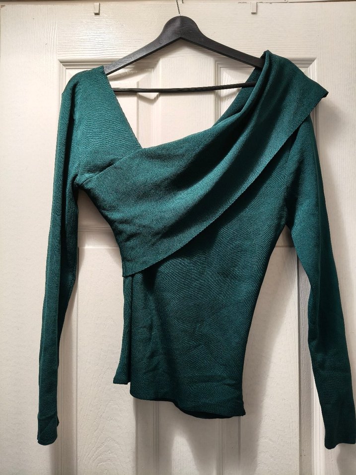 Drapeli V yakalı, uzun kollu, yeşil kazak. Yumuşak keten kumaştan, vücuda oturan midi boyda, çağdaş tarzda.