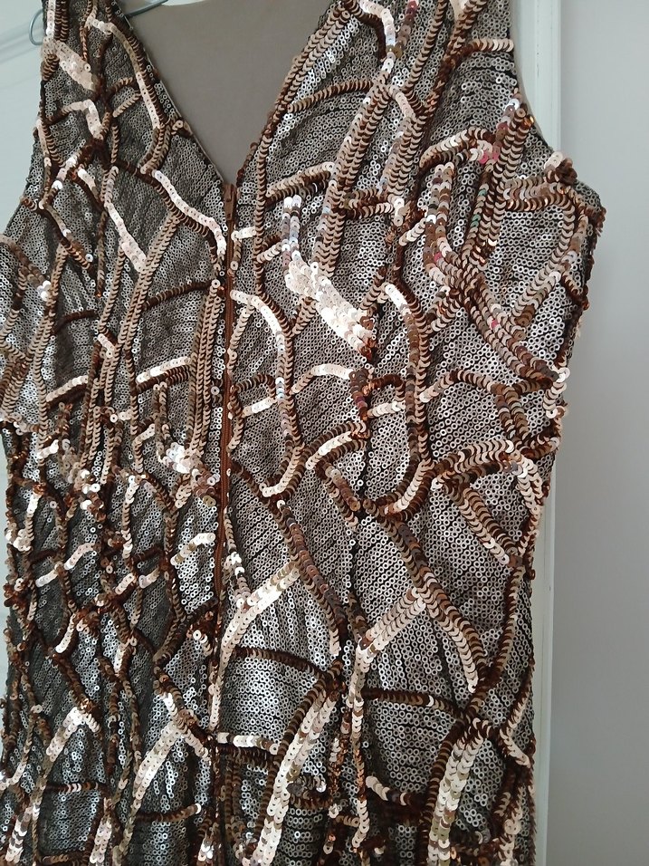 V yaka ve kolsuz tasarıma sahip bu dar kesim uzun elbise, bohem tarzda yılan desenli ve drapeli detaylarla parti için uygun.