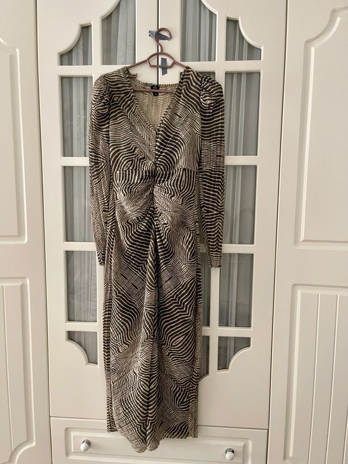 V yaka, drapeli ve zebra desenli uzun elbise, gri ve kahverengi tonlarında. İnce askılı astar elbisesi ve vücuda oturan kesime sahip, yumuşak sentetik kumaştan, ofis için uygun.S beden ve M bedene uyumludur