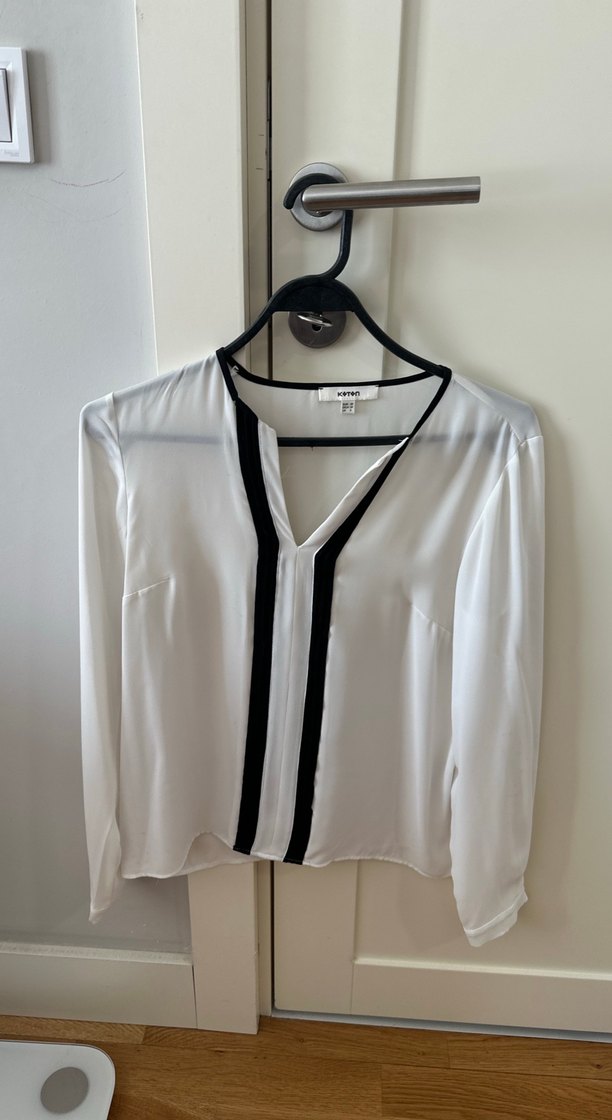 V yaka, uzun kollu, düğmeli beyaz kadın gömlek. İpek gibi dokusu ve bol kesimiyle gündelik sokak stiline uygun.