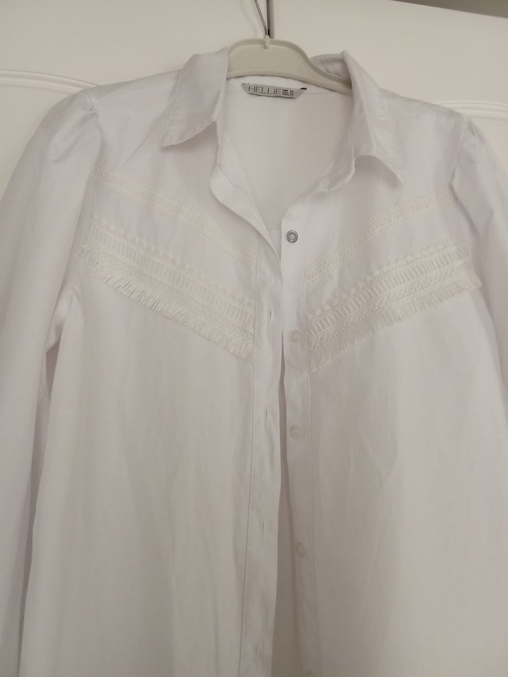 Beyaz keten kumaştan, V yakalı ve düğmeli kadın gömleği. Uzun kollu, bol kesim ve midi boyda, günlük kullanıma uygun bohem tarzda.