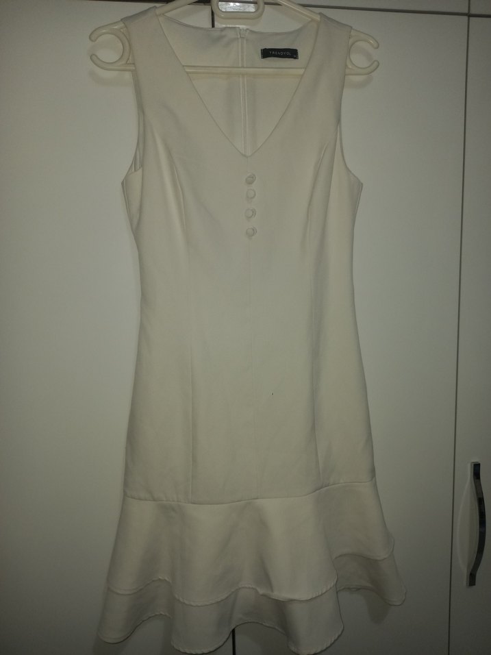 V yakalı, düğmeli beyaz midi elbise. Kolsuz, normal kesim ve volanlı etek ucu ile ofis kullanımı için uygun.34 beden trendyol marka