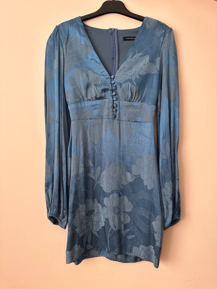 V yaka ve düğmeli, bol kesim midi elbise. Uzun kollu, lacivert tie-dye ve vintage çiçek desenli bohem tarzda.