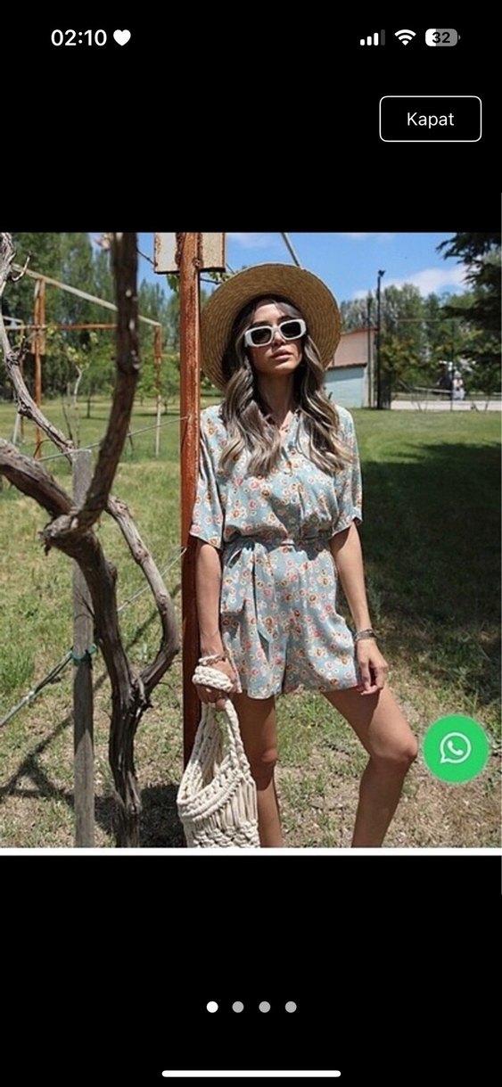 V yaka, düğmeli, kısa kollu ve bol kesim tulum. Bej pastel tonlarında batik desenli, sentetik kumaştan üretilmiştir. Günlük sokak stili için uygundur. Bir problemi yoktur 2 defa kullanılmıştır