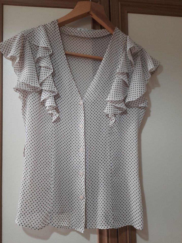 V yaka ve düğmeli, bol kesim, beyaz zemin üzerine gri puantiyeli, fırfırlı kolsuz bluz. Yumuşak sentetik kumaştan, günlük kullanım için uygun bohem tarz.