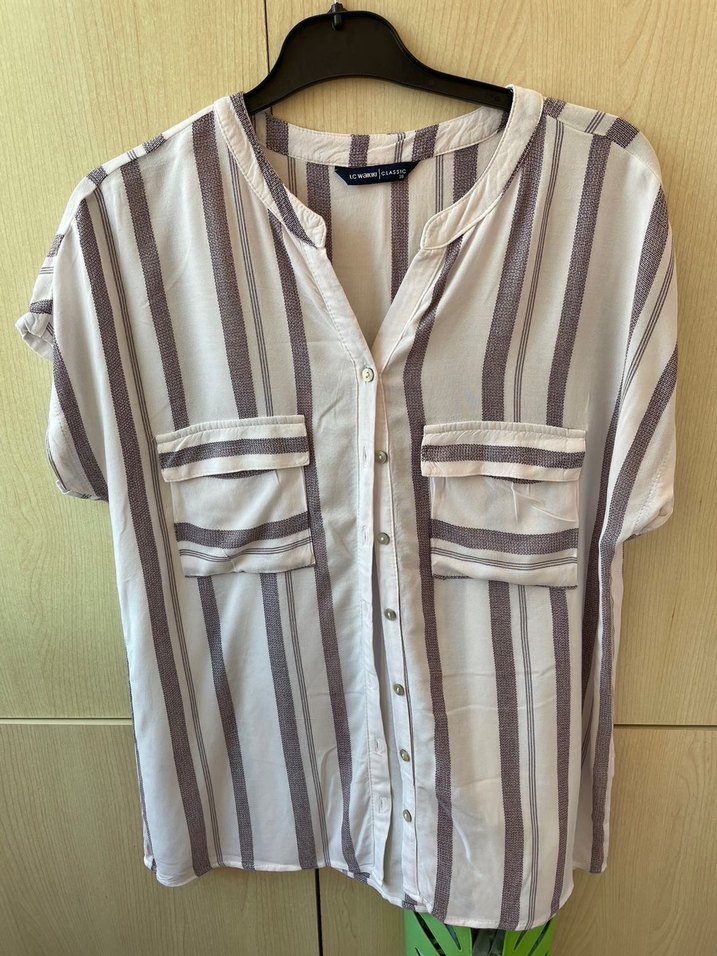 Bej renkte pamuklu kumaştan yapılmış bu gömlek, V yaka ve kısa kolludur. Dikey çizgili, düğmeli ve rahat kesimlidir, günlük kullanıma uygundur. Fotoğraflarda görüldüğü gibidir.