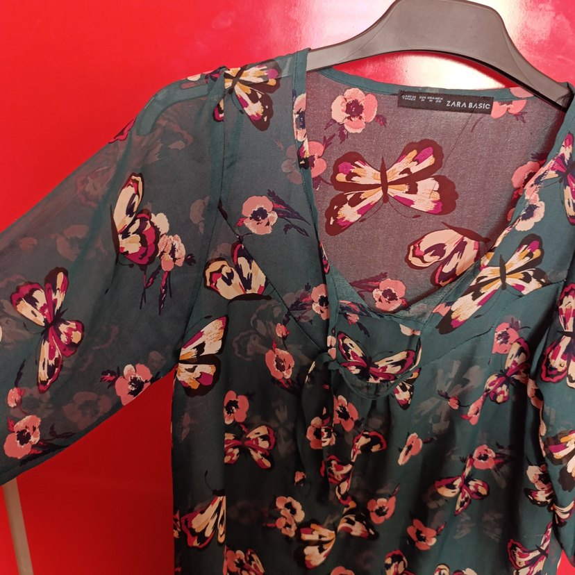 V yaka ve düğmeli, bol kesim, yumuşak kumaştan yapılmış koyu renkli çok renkli kelebek ve çiçek desenli bluz, romantik buluşmalar için uygun.