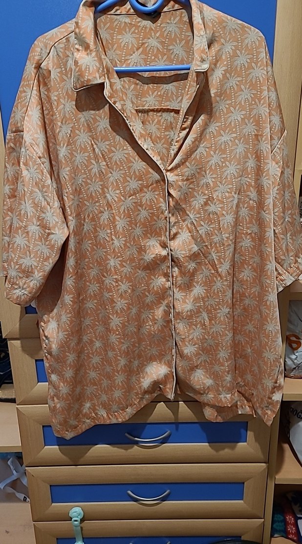 Gevşek kesim, kısa kollu, V yaka ve düğmeli kadın gömleği. İpeksi kumaş, pastel bej tonlarında batik desenli, bohem ve vintage stilini yansıtır. Günlük kullanıma uygundur.