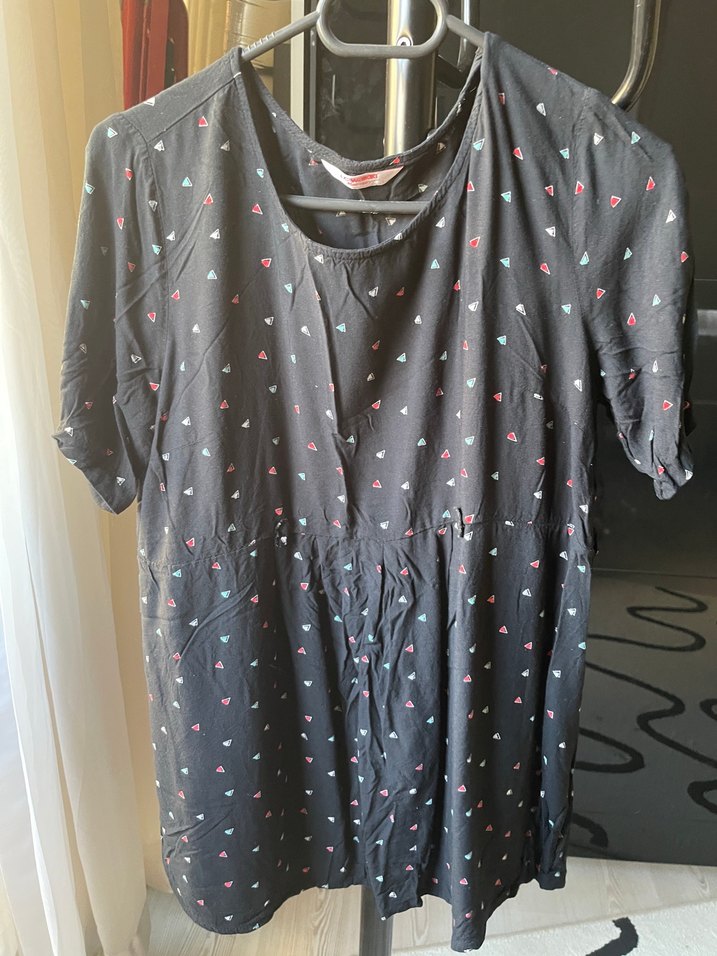 V yaka, düğmeli, kısa kollu gri hamile tişörtü, rahat kesim ve küçük baskılı desenlerle sokak stiline uygun. Lcw marka L beden ben 80 kiloyken giymiştim son ayima kadar rahat hasarsiz ve temiz