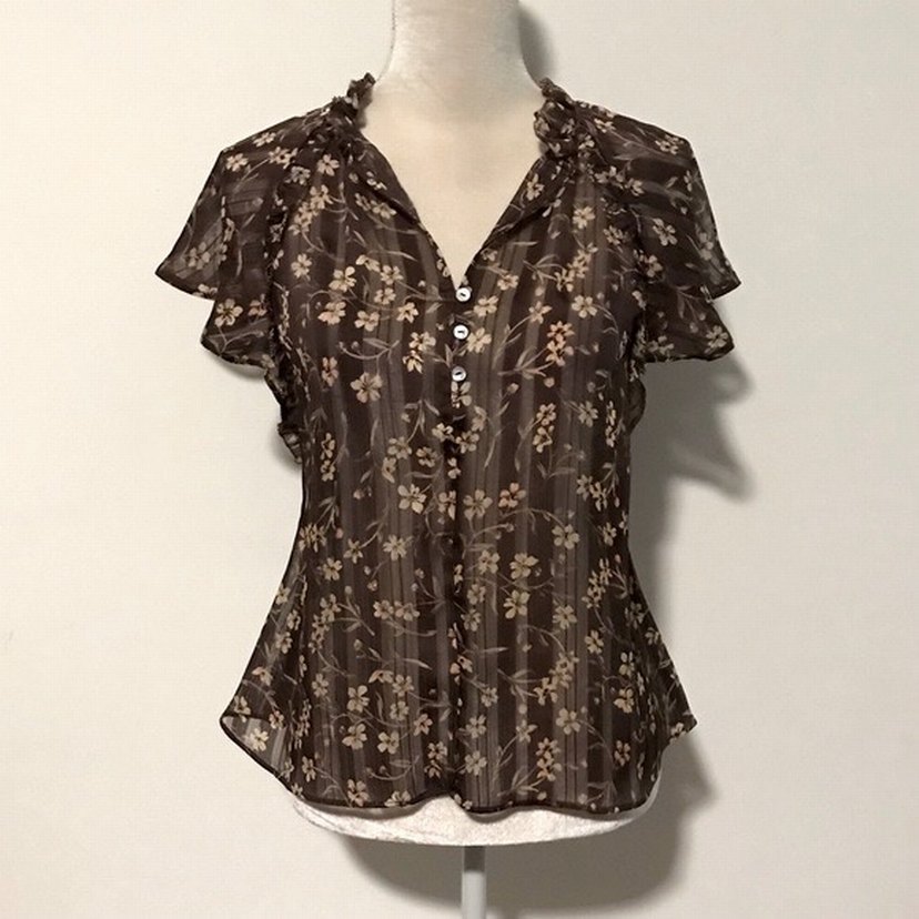Kahverengi, V yakalı, kısa kollu, düğmeli ve bol kesim bohem tarzda, vintage desenli bir bluz. Ofis kullanımı için uygundur. H&M kahverengi tül gömlek bluz. Krem çiçek desenli kahverengi tül bluz. Kolları fırfırlı. Önden bağlama detaylı.