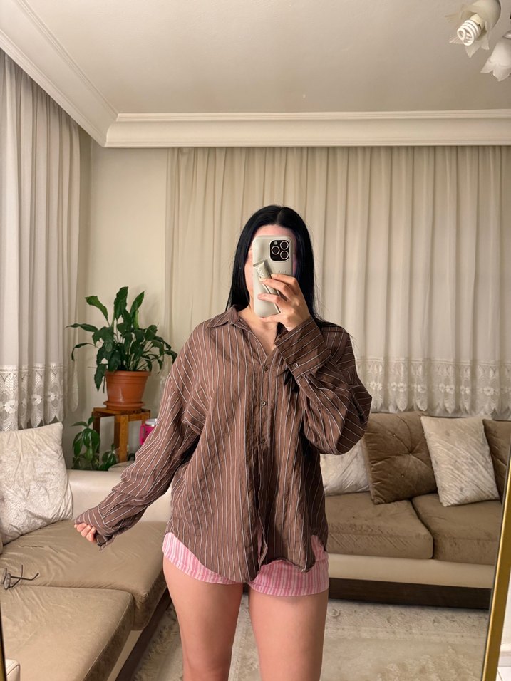 Pamuklu kahverengi, V yaka, düğmeli, uzun kollu, midi uzunlukta bol kesim kadın gömleği. Rahat, normcore tarzıyla günlük kullanıma uygun.