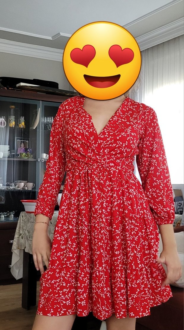 V yaka, düğmeli, uzun kollu, midi uzunlukta, bol kesim kırmızı bohem elbise. Canlı renkli baskılı ve sentetik kumaştan üretilmiştir. Günlük kullanıma uygundur. Marka temsilidir.