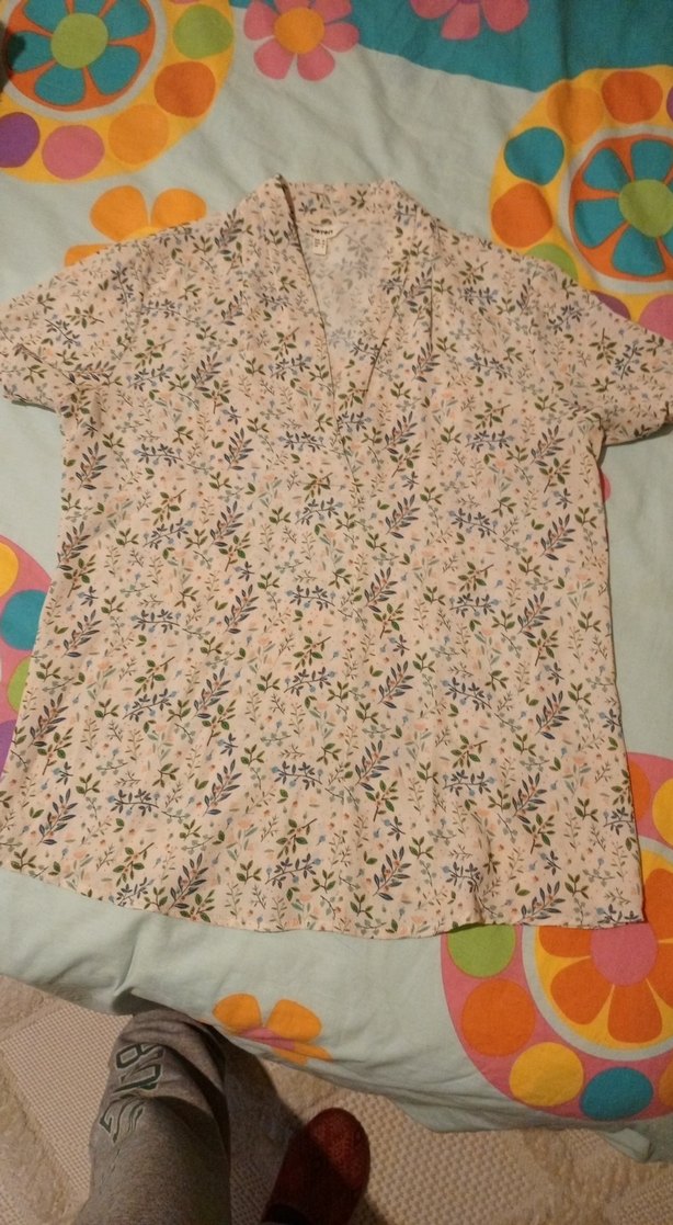 Bohem tarzı, düğmeli, kısa kollu, V yakalı, pastel bej renkli, çiçek desenli bol kesim kadın gömleği.