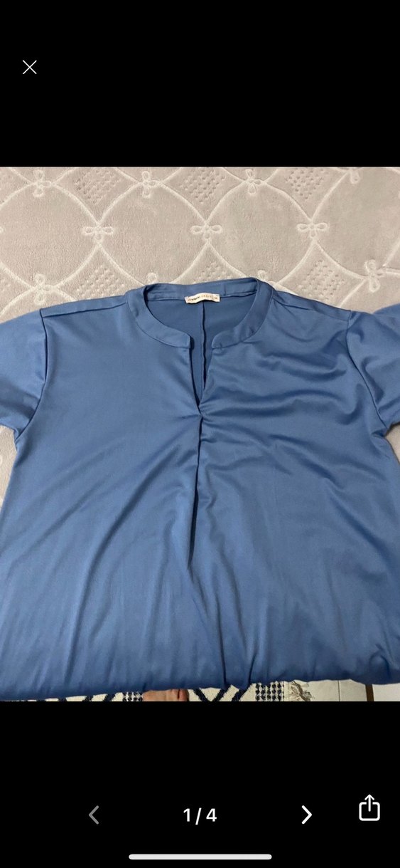 Mavi renkte, V yakalı, kısa kollu, düğmeli ve bol kesim hamile tişörtü. Normal boyda ve günlük kullanım için uygun, yumuşak sentetik kumaştan.