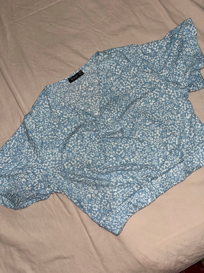 V yaka, düğmeli, kısa kollu, bol kesim mavi desenli bluz. Sentetik kumaştan, günlük rahat sokak stili için uygundur.