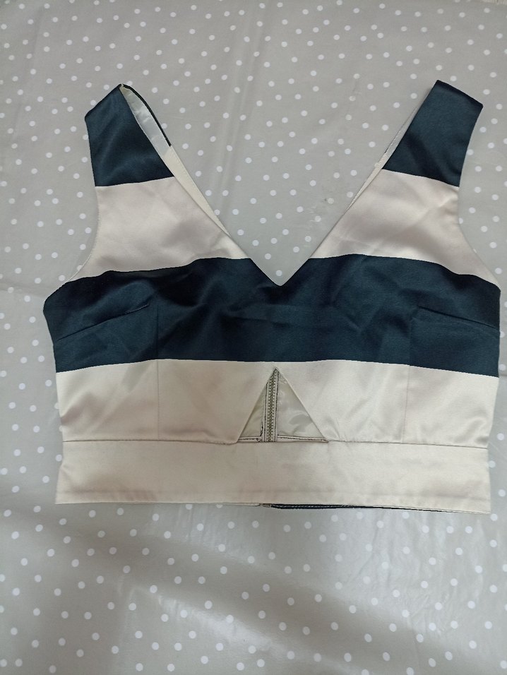Düğmeli, V yakalı, bej ve gri renk bloklu, sentetik kumaştan yapılmış, vücuda oturan midi uzunlukta kolsuz büstiyer. iki koltuk arasî 40 uzunluğu 37