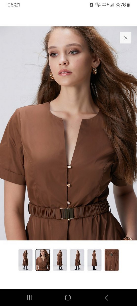Bej renkli, V yakalı ve kısa kollu midi elbise. Düğmeli ve parlak, ipeksi kumaştan, günlük kullanıma uygun.