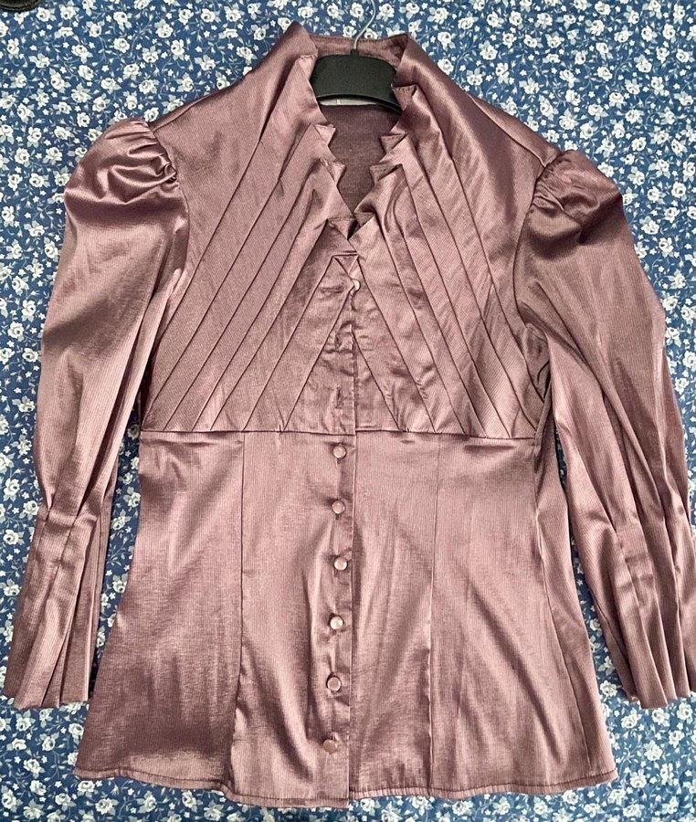 V yaka ve düğmeli önü olan, parlak saten kumaştan yapılmış, uzun kollu ve midi boy, vintage goth tarzında, oturan kesim kadın gömleği.