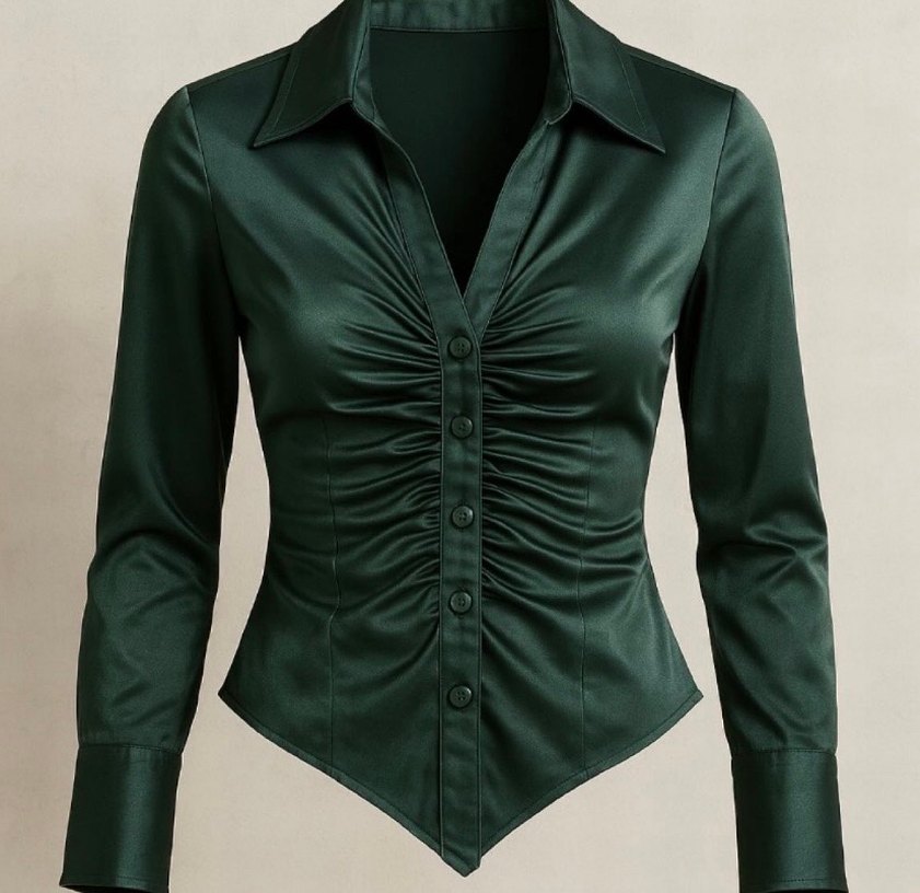 V yaka, düğmeli ve parlak saten kumaştan yapılmış, oturmalı kesim kadın gömlek. Uzun kollu ve normal boyda, ofis için cesur gotik tarzda.