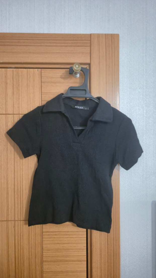 Siyah Crop V yakalı ve düğmeli detaylara sahip. Marka: WOLEE.