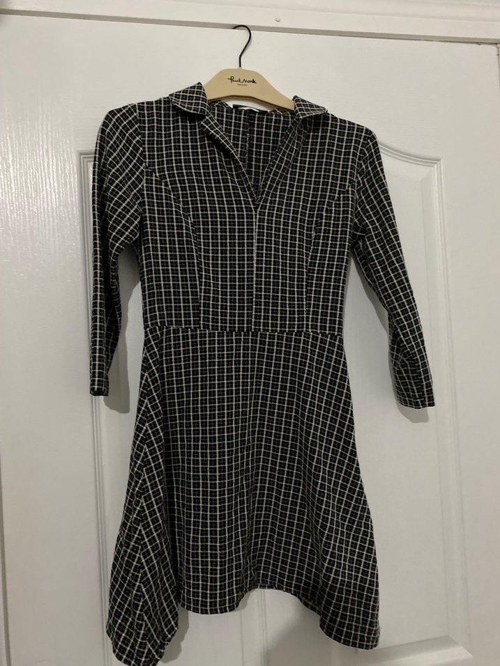V yaka, uzun kollu, düğmeli siyah-gri kareli midi elbise. Sentetik kumaştan, trend günlük tarz için uygun.