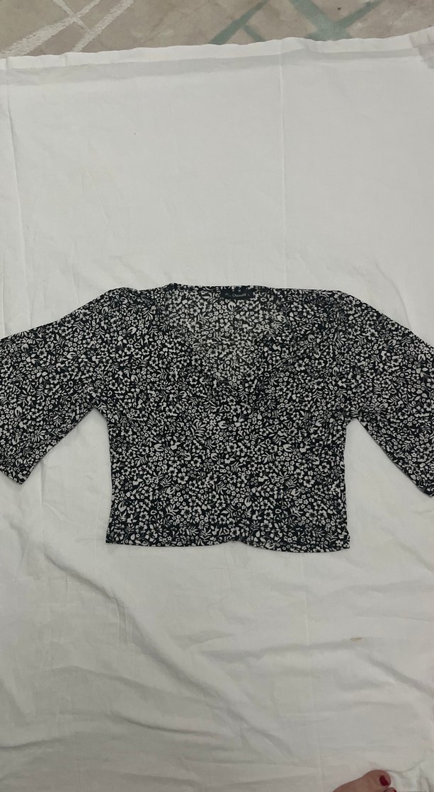 Siyah renkte, V yakalı ve düğmeli uzun kollu bluz. Bol kesim, batik desenli ve normal boyda, sentetik kumaştan üretilmiştir.