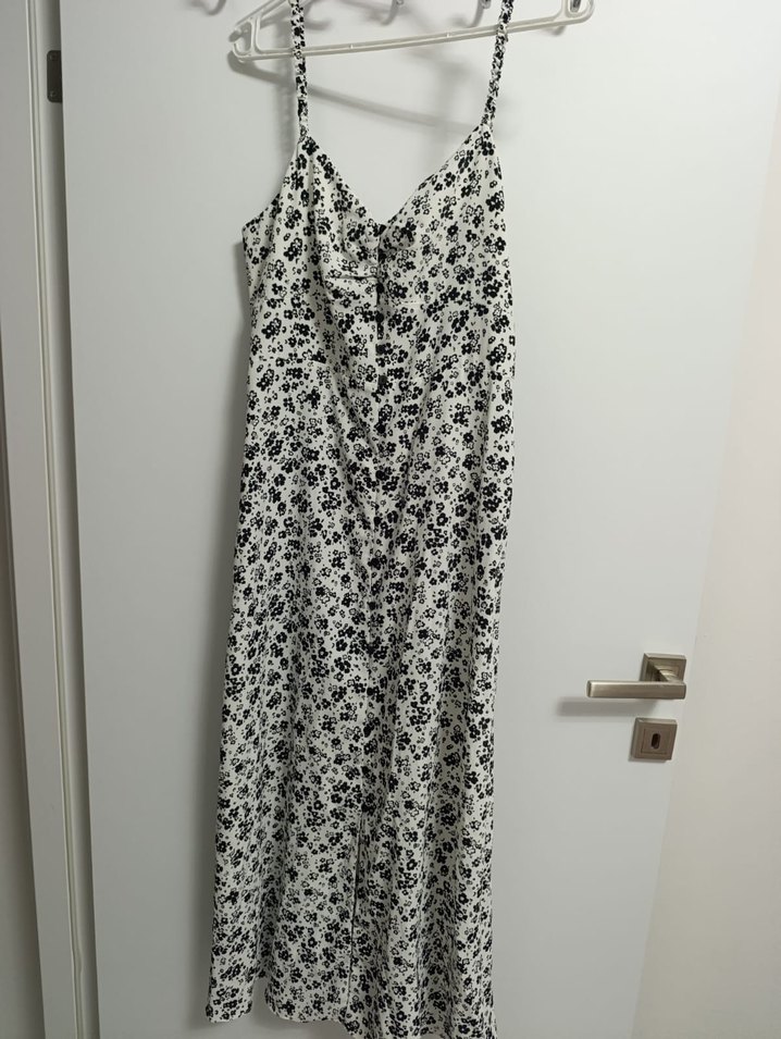 V yaka, düğmeli, uzun ve kolsuz kadın elbisesi. Gri ve beyaz tie-dye deseniyle Paris sokak modası ve bohem tarzını birleştirir. Yumuşak sentetik kumaştan yapılmıştır.