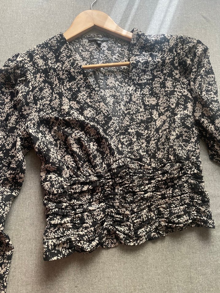 Uzun kollu, V yaka ve düğmeli önü olan bol kesim kadın bluz. Koyu renkli batik desenli, yumuşak sentetik kumaştan yapılmıştır. Günlük kullanıma uygundur.