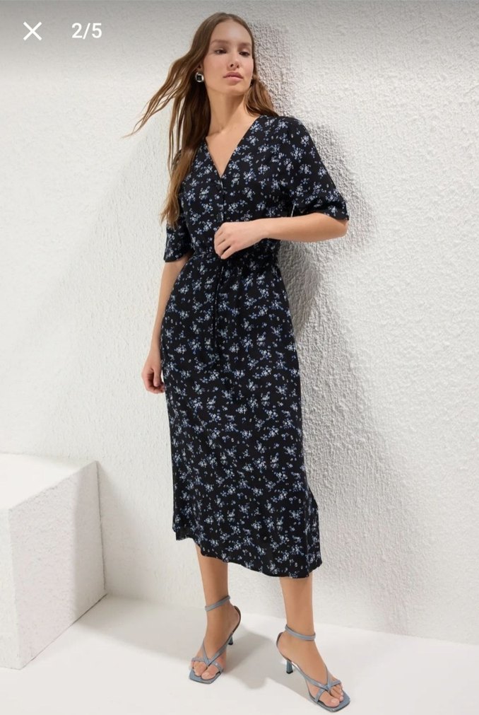 V yaka, kısa kollu, düğmeli ve bol kesim siyah uzun elbise. Sentetik kumaştan, günlük rahat kullanım için uygundur.