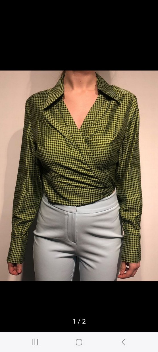 Bu dar kesim kadın gömlek, V yaka ve düğmeli uzun kollara sahiptir. Yeşil ve gri kareli deseniyle ofis ve günlük kullanıma uygundur.