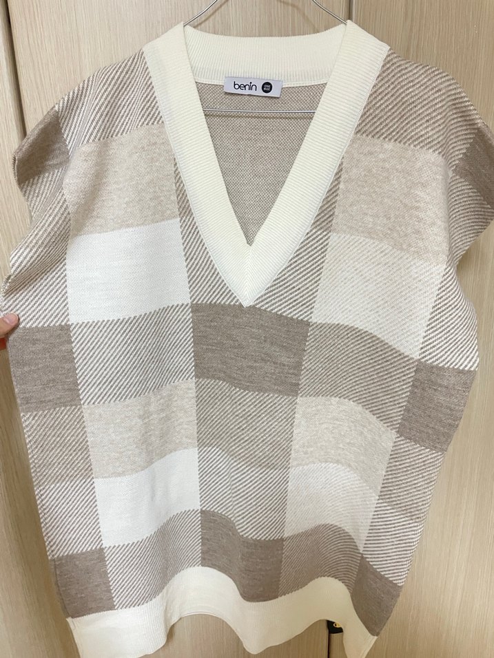 V yaka, ekose desenli ve gevşek kesimli bej ve gri renklerde, triko kumaştan kadın süveter. 2 , 3 kez giyildi. Herhangi bir defosu yok. Modanisadan satın alındı.