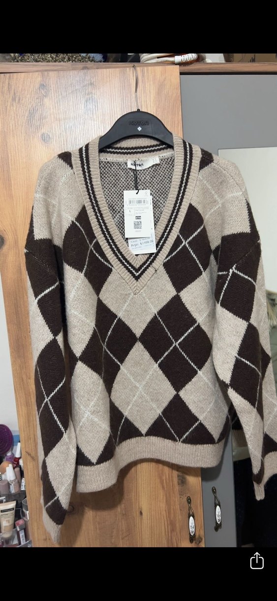 V yaka, uzun kollu, kahverengi ekose desenli örme kazak. Salaş kesimi ve rahat dokusuyla günlük kullanıma uygun.