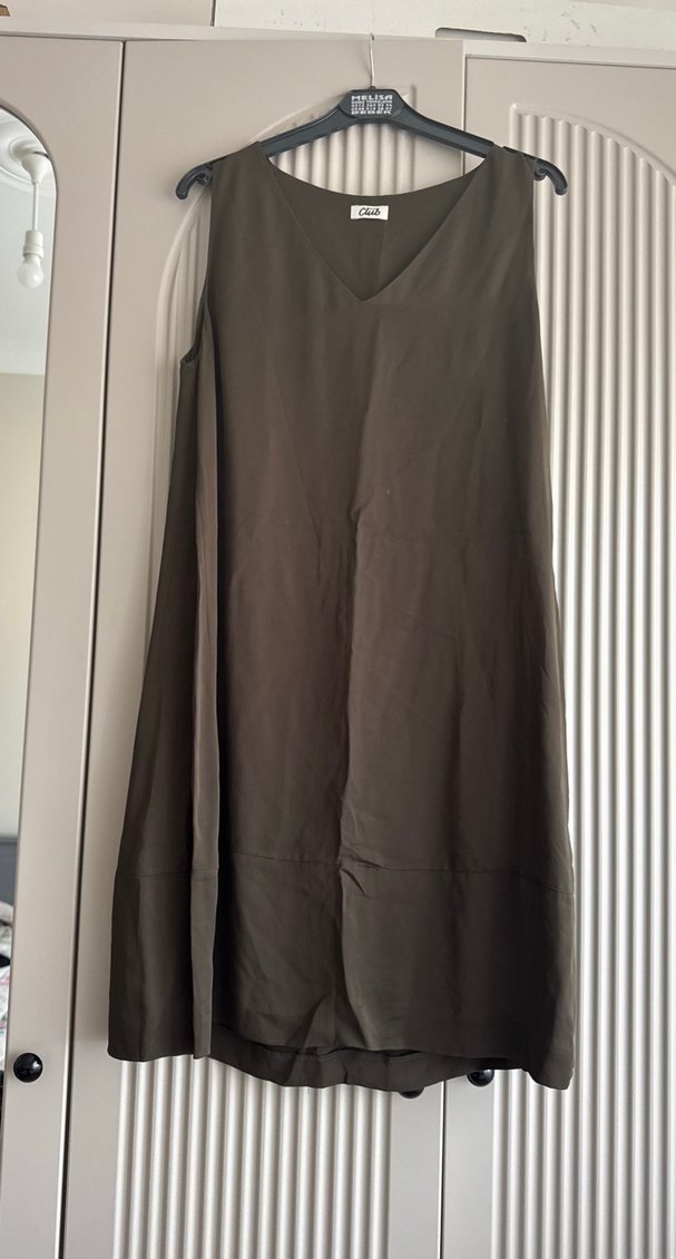 V yaka, kolsuz, diz üstü, koyu haki renginde elbise. Salaş kesimli, ipeksi dokulu, sade ve desen içermeyen minimalist tarzda.