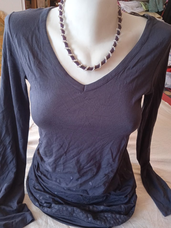 V yakalı, uzun kollu, hafif likrali .koyu mavimsi renkte, diz üzeri boyda, rahat kullanıma uygun. ön etek boyu sim detaylı. güzel bir elbise . yalnız yakanın hemen altında minikcik defosu varmış..