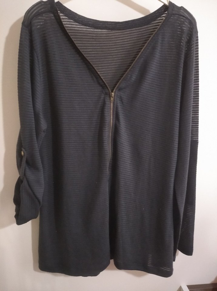 V yaka ve fermuarlı, uzun kollu, bol kesim gri kadın bluz. Yumuşak sentetik kumaştan üretilmiş, günlük kullanım için uygundur.