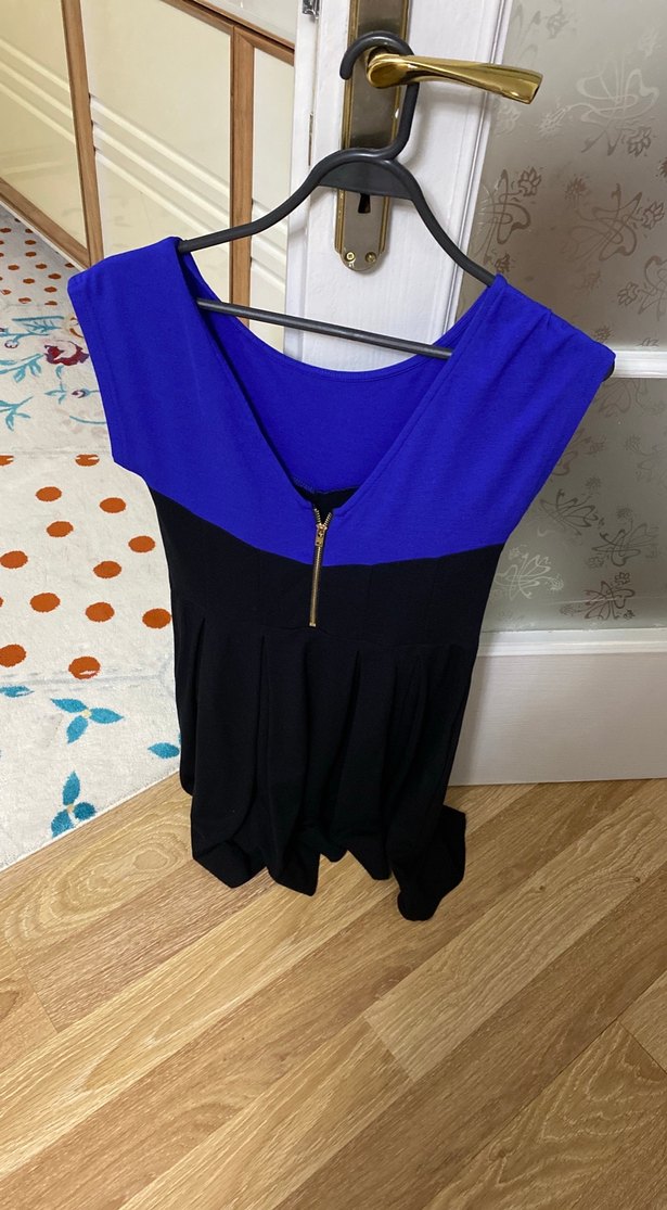 V Yaka Fermuarlı Mavi-Siyah elbise