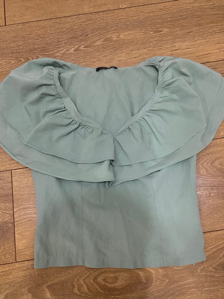 Bej renkte, keten kumaştan V yakalı ve fırfırlı detaylı, bol kesim kısa kollu midi uzunlukta bluz. Bohem ve vintage tarzına uygundur.