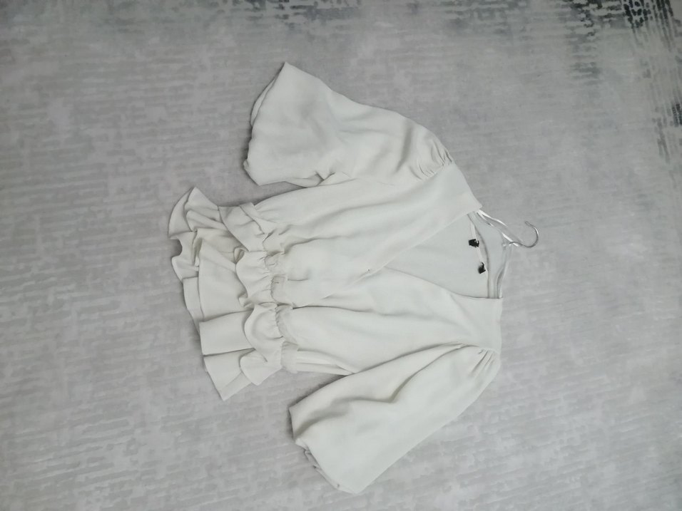 Bol kesim beyaz sentetik bluz, uzun kollu ve V yakalı, fırfır detaylı. Kısa boy, günlük kullanıma uygun.