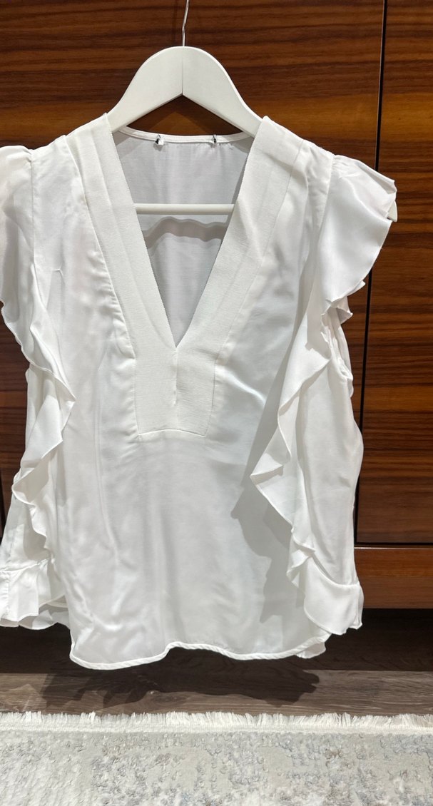 V yaka ve kolsuz tasarıma sahip beyaz keten bluz, fırfır detaylarıyla bohem Paris tarzını yansıtıyor. Rahat ve midi boyda.