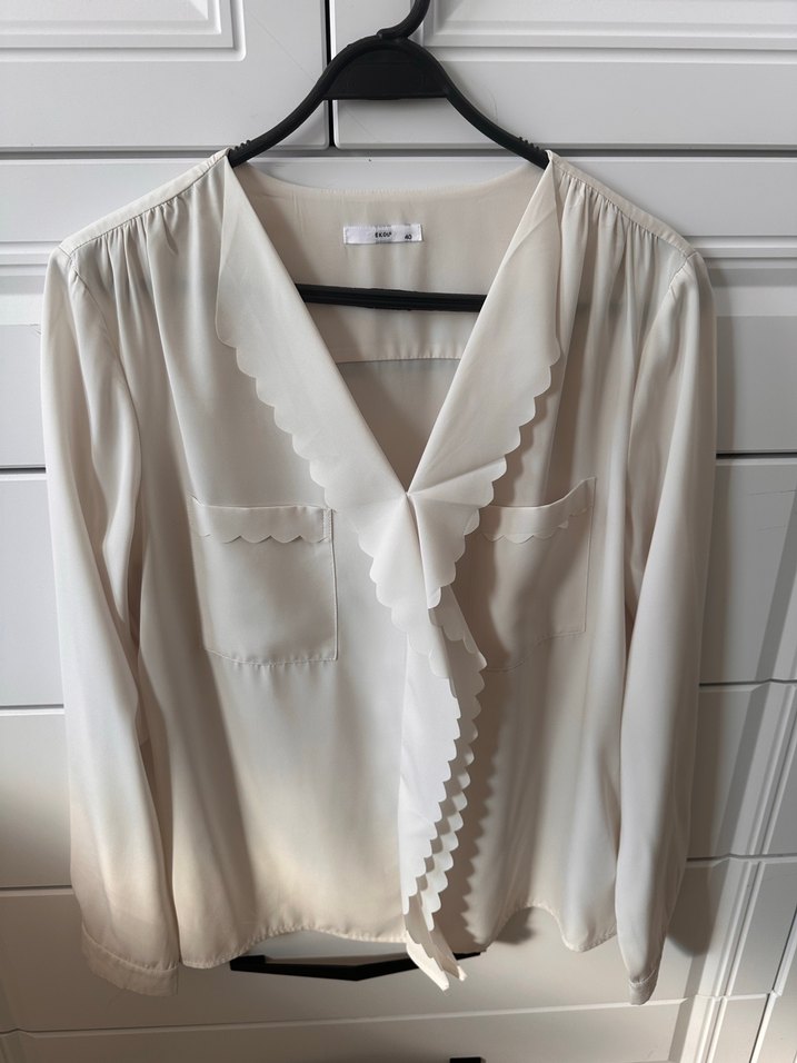 V yakalı, fırfırlı detaylı kırık beyaz kadın gömleği. Uzun kollu, bol kesim, ipeksi kumaştan, ofis için uygun düz model. ✨