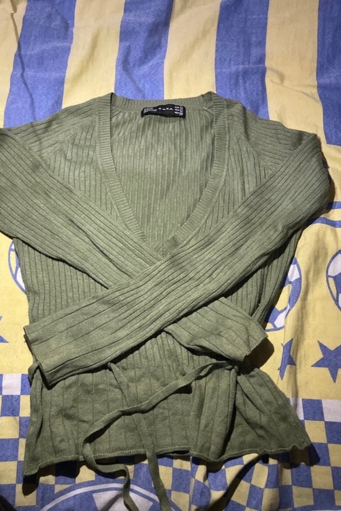 Yeşil renkli, fitilli örgü yapısında, V yakalı ve uzun kollu kadın kazak. Normal midi boyda, yumuşak keten kumaştan, günlük sokak stili için uygun.