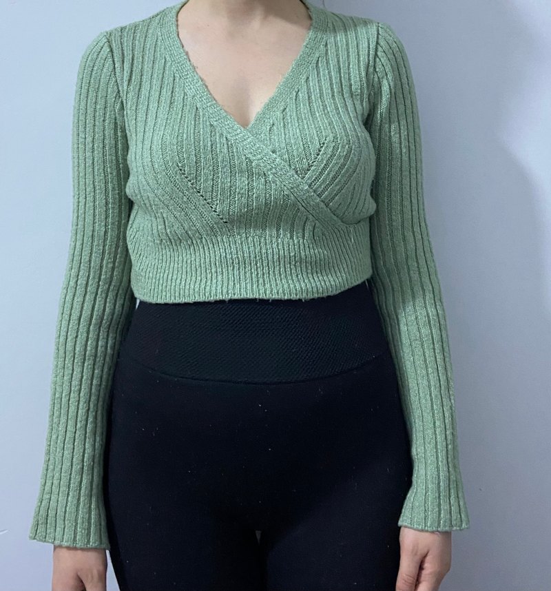 V yaka, fitilli ve uzun kollu kadın kazak. Yumuşak triko kumaştan, pastel yeşil renkte, rahat sokak tarzına uygun.