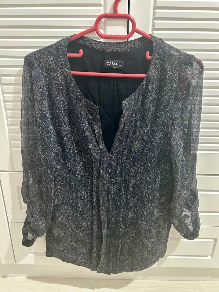 Uzun kollu, düğmeli, V yaka ve bol kesimli kadın bluzudur. Gri bağlama desenli, normal midi boyda ve sentetik kumaştan üretilmiştir. Casual ve ofis kullanımı için uygundur. Marka: CAROLL. Bana dar geldiği için kullanamadım. Deformesi yok. Kumaş pantolon üzerine güzel duracaktır.