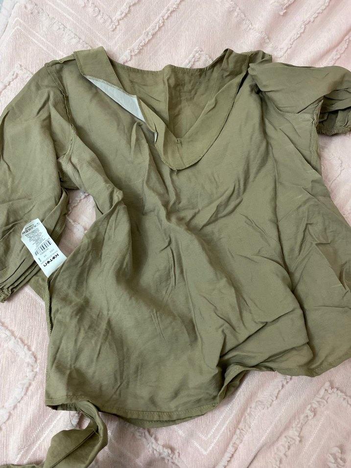 V yaka, uzun kollu, bol kesim hemşire önlüğü. Midi boyda, gri bej renkte, yumuşak ve rahat kumaşlıdır.