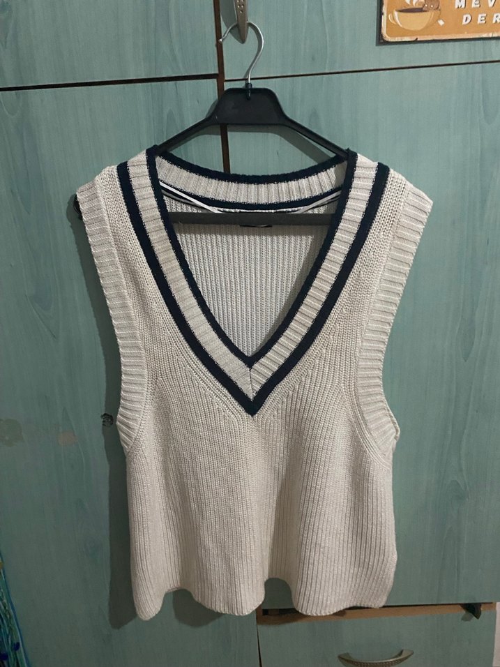 V Yaka Gri-Beyaz Kadın Triko Süveter