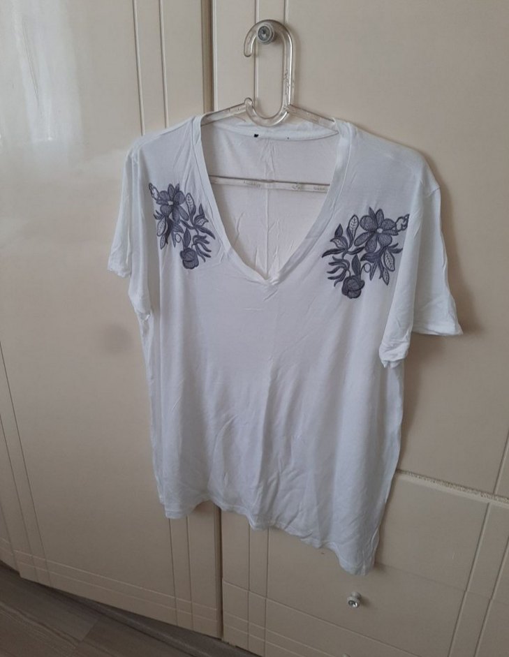 Pamuklu beyaz kadın tişörtü, V yaka ve kısa kolludur. Göğüs kısmında gri çiçek baskıları vardır. Salaş kesim ve normal boyda, rahat sokak stiline uygundur. en 60 boy 72 cm