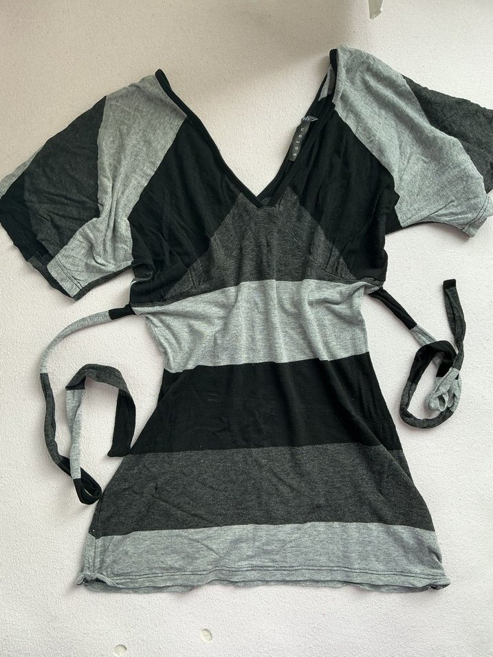 V yaka çizgili desenli bluz, belden bağlamalı ipleri var. Birkaç yerinde ufak delikler var fakat çok göze çarpmıyor.