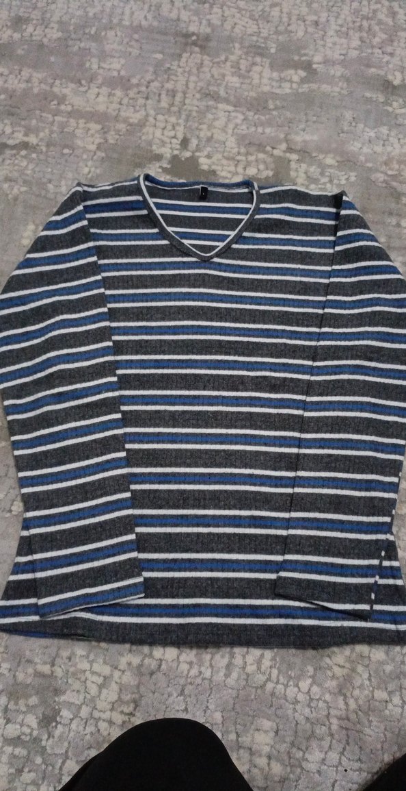 Kadınlar için uzun kollu, V yakalı gri, mavi ve beyaz çizgili triko. Rahat kesimli, normal boyda ve yumuşak sentetik kumaştan, günlük sokak stili için uygundur.